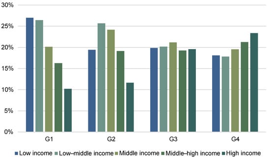 Recent studies have found that the income elasticity of food demand decreases as income increases [31,32,36]. In order to verify the heterogeneity of the income of populations with different proportions of WAP, the four WAP groups were divided into five equal groups according to income. The income distribution results are shown in Figure 2. There was a certain income heterogeneity between the four WAP groups, with the G1 group representing mainly low income and low–middle incomes, consistent with the life cycle hypothesis.
