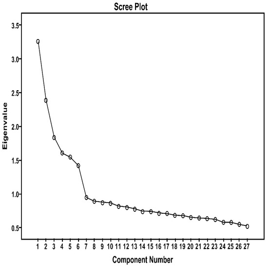 The principal component method adopted for the analysis. After the varimax, the number of factors obtained was determined by observing the scree plot and the characteristic root in the results. The results of the analysis are shown in Figure 2. The plot demonstrates how the first seven factors first decrease quickly and then decrease more slowly. Therefore, the six factors underlie the majority of variance in explaining work stress, which is in line with the results of the clustering analysis.