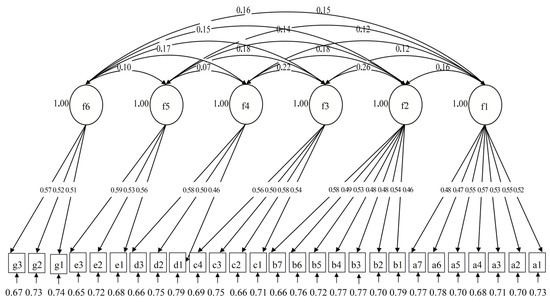 The results of the confirmatory factor analysis are as follows: x2 = 319; df = 309; x2/df = 1.03; NNFI is 0.995, CFI is 0.995, and RMSEA is 0.007. All these results meet the standards of psychology and statistical measurement and showed good fit, indicating that the six-factor model was sufficient in describing the structure of work stress. Meanwhile, as shown in Figure 3, the factor loadings of the model structure were greater than 0.4. The structure of coal miners’ work stress is shown in Table 10.