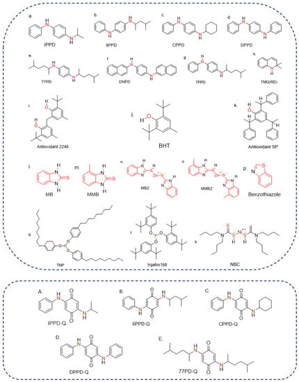The structures of typical antioxidants and some of their TPs ((a–h) are for amine antioxidants, (i–k) are for phenolic antioxidants, (l–p) are for heterocyclic antioxidants, (q,r) are for phosphite antioxidants, (s) is for nickel salts antioxidants, (A–E) are for TPs, the red parts represent the similar structure of the same type of antioxidants).