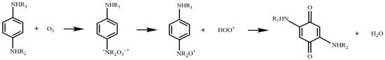 The TPs of rubber antioxidants have been observed in some studies under environmental conditions. As one of the widespread rubber antioxidants, amine antioxidants (PPDs: TMPPD, DPPD, 6PPD, and 6PPDTZ) could react with O3 (in parts per billion volume levels) in the environment and produce PPD-quinone [31]. A previous study clarified the early stage of oxidation reaction for various PPDs as a reaction between free radical cations and amine groups in PPDs in the presence of O3 [32]. The reactive mechanism between O3 and PPDs is given in Figure 2. O2•− is generated as a short-lived intermediate in O3 reaction, and could react quickly with PPDs in the aqueous solution. This was supported by the observation of a new band of TPs in the spectrum when O3 passed through the aqueous solution of PPD (TMPPD), which revealed the reaction between the amine groups in PPDs and the free radical cations produced by O3 under oxidation conditions. In addition, some other amine antioxidants with similar structures of amine groups were also supposed to have similar reactions with O3, which was suggested to be the main mechanism producing toxic quinone TPs of PPDs [33].