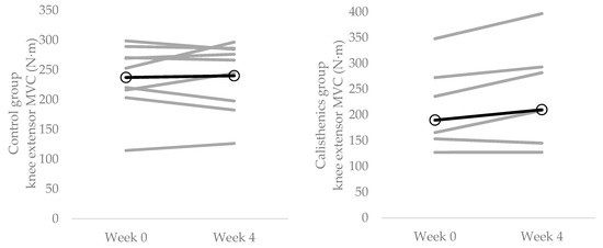 Figure 1. Individual changes (grey lines) in knee extensor MVC strength from baseline (week 0) to the end of the intervention (week 4). Left panel = control group; right panel = calisthenics intervention group. Dark lines represent group means.