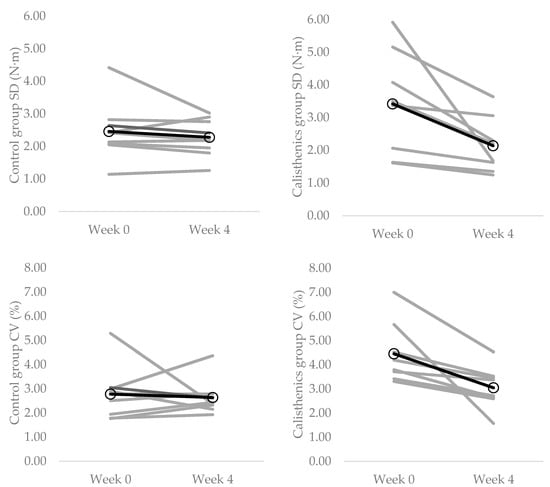 Figure 2. Individual changes (grey lines) in knee extensor force control during contractions at 40% MVC from baseline (week 0) to the end of the intervention (week 4). Top left panel = control group SD; Top right panel = calisthenics intervention group SD; Bottom left panel = control group CV; Bottom right panel = calisthenics intervention group CV. Dark lines represent group means.