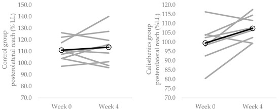 Figure 3. Individual changes (grey lines) in Y balance test posterolateral reach with left leg stance from baseline (week 0) to the end of the intervention (week 4). Left panel = control group; Right panel = calisthenics intervention group CV. Dark lines represent group means.