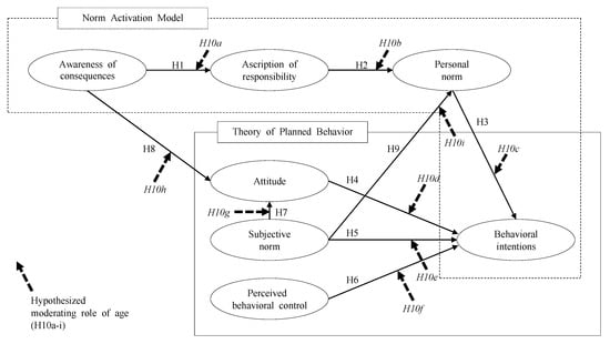 Contrary to arguments that older consumers have a higher tendency toward pro-environmental behaviors than younger consumers, some research also argues that younger consumers are more likely to consider environmentally friendly behavior because they are inclined to search for more information and become engaged in social issues [32]. For example, Zimmer et al. [74] stated that younger consumers are more concerned with environmental issues than older consumers. Han et al. [76] also proved that younger consumers show higher behavioral intentions than older consumers in the context of green hotels. Likewise, Wu et al. [31] found a moderating role played by age in the NAM framework. That study demonstrated that the impact of tourists’ personal norms on pro-environmental behavior is moderated by age, indicating that the younger tourist group presents a higher path coefficient than the older tourist group. Regardless of these contradictory results about the moderating effect of age, research commonly supports the significant role age plays from the perspective of pro-environmental behavior, providing clear evidence for the moderating effect of age in the NAM and TPB framework. Thus, the present study proposed these hypotheses: