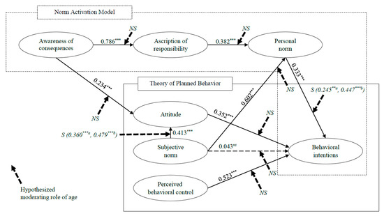 To test the moderating role of age, a multiple-group analysis was performed. The chi-square difference between the unconstrained and constrained models was used to prove the moderating role of age in each path of the integrated framework. The result of the analysis revealed that the effect of personal norms on behavioral intentions (Δχ2(1) = 4.179 > 3.84) and the effect of subjective norms on attitude (Δχ2(1) = 4.750 > 3.84) were moderated by age. More specifically, both paths show that the path coefficient of the high age group is higher than the low age group. Thus, H10c and H10g were supported. However, the other hypotheses were not statistically supported because their Δχ2(1) was lower than 3.84. The results of the multiple-group analysis are presented in Table 6, and the statistical results of this study are summarized in Figure 2.