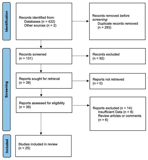 Overall, 422 studies were identified through database searches, and two additional articles were retrieved from the bibliographies of the included studies. Two hundred ninety-three duplicates were removed, and the remaining 131 articles were screened by title and abstract, which resulted in the exclusion of 92 irrelevant articles. Full-text screening was performed on 39 studies, and data for 25 studies were extracted for this meta-analysis [20,21,22,23,24,25,26,27,28,29,30,31,32,33,34,35,36,37,38,39,40,41,42,43,44]. Figure 1 depicts the various exclusions and selection procedures.