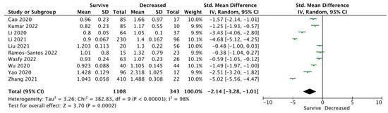 Ten studies reported Cystatin C levels among patients who survived to hospital discharge vs. patients who decreased. Pooled analysis showed statistically significantly differences between those groups (0.998 ± 0.225 vs. 1.328 ± 0.475 mg/dL, respectively; SMD = −2.14; 95%CI: −3.28 to −1.01; p < 0.001; Figure 2).