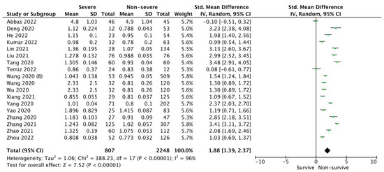 Pooled analysis of Cystatin C levels in COVID-19 severe vs. non-severe groups varied and amounted to 1.485 ± 1.191 vs. 1.014 ± 0.601 mg/dL, respectively (SMD = 1.81; 95%CI: 1.29 to 2.32; p < 0.001; Figure 3).