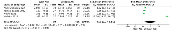 Additionally, three studies reported Cystatin C levels among patients with COVID-19 with and without AKI. Pooled analysis showed that Cystatin C levels in patients with AKI was 1.562 ± 0.885 mg/dL, compared to 0.811 ± 0.108 mg/dL for patients without AKI (SMD = 4.56; 95%CI: 0.27 to 8.85; p = 0.04; Figure 4).