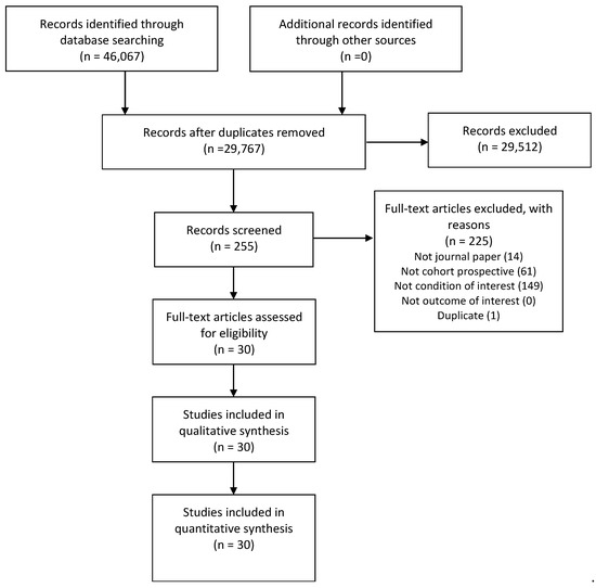 Searches identified 46,067 records and 29,767 titles and abstracts were screened after removing duplicates. Then, 255 potential full texts were assessed for our eligibility criteria and 30 studies investigating 13,717 patients hospitalized with COVID-19 were included in qualitative and quantitative synthesis. The main reasons for the exclusion of potential full texts were: not meeting the condition of interest (n = 149); not a prospective cohort (n = 61); not a journal paper (n = 14); and duplicates (n = 1) (see flow of studies in Figure 1 and reasons for exclusion of potential full texts in Table S2).