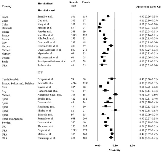 Figure 2. Prognosis of mortality in hospitalized people with COVID-19. For analysis, the studies were grouped by country and by hospital setting (hospital ward or ICU). Estimates of proportions for dichotomous data, considering the number of events and sample size, were reported. Abbreviations: USA = United States of America; UK = United Kingdom; IC = confidence interval. References: Brandão et al. [14]; Cao et al. [15]; Yang et al. [16]; Madsen et al. [17]; Jourdes et al. [18]; Kaeuffer et al. [19]; Allenbach et al. [20]; Giacomelli et al. [21]; Cortes-Telles et al. [22]; Olivas-Martínez et al. [23]; Myrstad et al. [24]; Piwowarczyk et al. [25]; Rodriguez-Molinero et al. [26]; Roberts et al. [27]; Dzupová et al. [28]; Schmidth et al. [29]; Kayina et al. [30]; Radovanovic et al. [31]; Namedys-Silva et al. [32]; Estella et al. [33]; Barrasa et al. [34]; Rodríguez et al. [35]; Pineiro et al. [36]; Taboada et al. [37]; Ferrando et al. [38]; Larsson et al. [39]; Thomson et al. [40]; Gupta et al. [41]; Molnar et al. [42]; Cummings et al. [43].