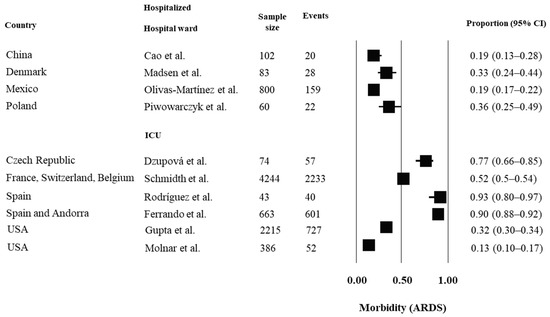 Figure 3. Prognosis of morbidity, considering ARDS, in hospitalized people with COVID-19. For analysis, the studies were grouped by country and by hospital setting (hospital ward or ICU). Estimates of proportions for dichotomous data, considering the number of events and sample size, were reported. Abbreviations: ARDS = acute respiratory distress syndrome; USA = United States of America; IC = confidence interval. References: Cao et al. [15]; Madsen et al. [17]; Olivas-Martínez et al. [23]; Piwowarczyk et al. [25]; Dzupová et al. [28]; Schmidth et al. [29]; Rodríguez et al. [35]; Ferrando et al. [38]; Gupta et al. [41]; Molnar et al. [42].