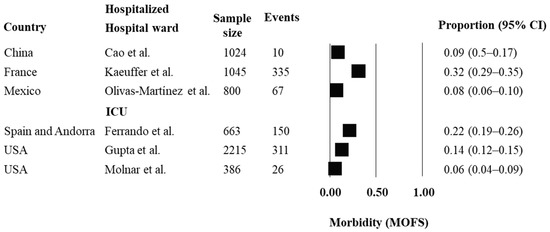Figure 4. Prognosis of morbidity, considering MOFS, in hospitalized people with COVID-19. For analysis, the studies were grouped by country and by hospital setting (hospital ward or ICU). Estimates of proportions for dichotomous data, considering the number of events and sample size, were reported. Abbreviations: MOFS = multiorgan failure syndrome; USA = United States of America; IC = confidence interval. References: Cao et al. [15]; Kaeuffer et al. [19]; Olivas-Martínez et al. [23]; Ferrando et al. [39]; Gupta et al. [41]; Molnar et al. [42].