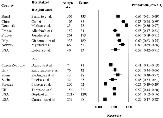 Figure 5. Prognosis of recovery in hospitalized people with COVID-19. For analysis, the studies were grouped by country and by hospital setting (hospital ward or ICU). Estimates of proportions for dichotomous data, considering the number of events and sample size, were reported. Abbreviations: ARDS = acute respiratory distress syndrome; USA = United States of America; UK = United Kingdom; IC = confidence interval. References: Brandão et al. [14]; Cao et al. [15]; Madsen et al. [17]; Allenbach et al. [20]; Jourdes et al. [18]; Giacomelli et al. [21]; Myrstad et al. [24]; Roberts et al. [27]; Dzupová et al. [28]; Radovanovic et al. [31]; Rodríguez et al. [35]; Pineiro et al. [36]; Larsson et al. [39]; Gupta et al. [41]; Thomson et al. [40]; Cummings et al. [43].