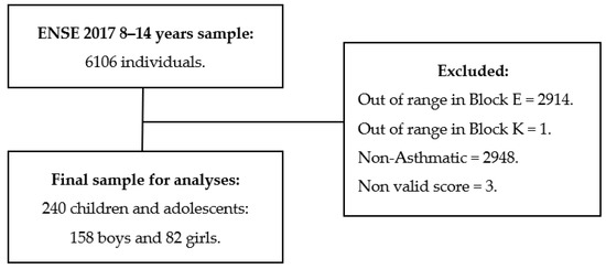 The sample used was extracted from the Spanish National Health Survey (ENSE 2017), through the Children Questionnaire. The eligibility criteria included (1) individuals between 8 and 14 years (2) who had an asthma diagnosis; (3) those participants who scored outside the 1–5 range on “block E” related to HRQoL and (4) those who scored outside the 1–4 range on “block K”, related to PA habits were excluded. Thus, although the initial sample size was 6106 participants, after applying these criteria, the final sample was composed of 240 participants (Figure 1).