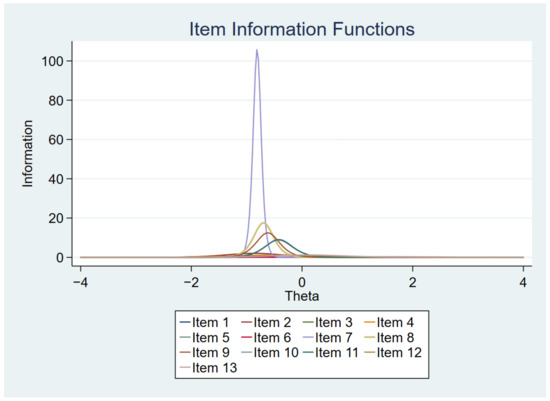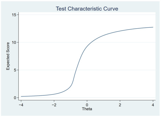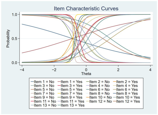 Table 4 presents the final IRT logistic model after removing items with low discrimination power. In this final model, the items “received guidance on healthy eating” (α = 17.9), “received guidance on maintaining adequate weight” (α = 8.01), “received guidance on physical activity” (α = 6.84), “received guidance on not drinking to excess” (α = 5.75), “received guidance on not smoking” (α = 5.63) and “received a request for blood tests” (α = 2.90) had the highest discrimination parameters (>1.70, very high discrimination), being the most informative items about the latent variable.
