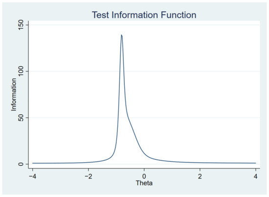 In the IRT, two parameters are generated for each item: alpha and beta. Alpha values have the following interpretation: 0 (no discrimination); 0.01 to 0.34 (very low discrimination); 0.35 to 0.64 (low discrimination); 0.65 to 1.34 (moderate discrimination); 1.35 to 1.69 (high discrimination); ≥1.70 (very high discrimination) and +∞ (perfect discrimination) [22]. The beta indicates the participant’s degree of difficulty in answering the item. Initially, the modeling was carried out with all items that presented complete data (n = 492) that encompassed 17 variables. Next, alpha values < 0.65 were excluded from the final model. The assumption of unidimensionality, assumption of the IRT, was verified through factor analysis.
