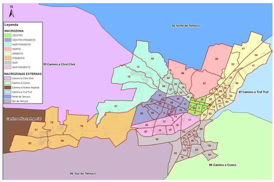 Zoning defined in Stage I of the travel diary study in Temuco (Taken from Actualización Plan De Transporte Temuco, Etapa II [12].