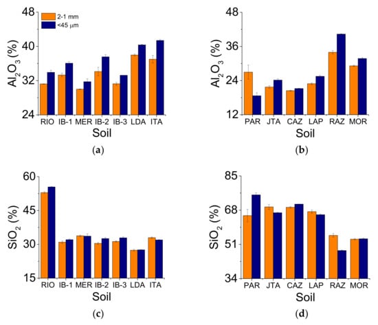 In the clayey soils, the most abundant oxides were Al2O3 and SiO2 (Figure 1a,c), with other oxides showing the following sequence (most of the soils): Fe2O3 > TiO2 > SO3 (Tables S1 and S2—Supplementary Materials). In the loamy/sandy soils, the most abundant oxide was SiO2 (Figure 1d) followed by: Al2O3 > Fe2O3 > TiO2 > SO3 (Tables S1 and S2—Supplementary Materials). No direct relation was observed between the clay content and the amount of iron oxide in the clayey soils analyzed. A strong positive correlation between clay × Al2O3 (r = 0.73, p = 0.06) and sand × SiO2 (r = 0.83, p < 0.05) was found. However, for the loamy/sandy soils, with the exception of CAZ, which was not considered in the correlation analysis due to its high silt content, positive relations between clay × Al2O3 (r = 0.89, p < 0.05), clay × Fe2O3 (r = 0.90, p < 0.05), silt × Al2O3 (r = 0.93, p < 0.05), and sand × SiO2 (r = 0.97, p < 0.05) were observed. On the other hand, negative relations were found between sand × Al2O3 (r = −0.93, p < 0.05), clay × SiO2 (r = −0.95, p < 0.05), and silt × SiO2 (r = −0.95, p< 0.05). We must mention that these correlation analyses were carried out for the <45 μm aggregate size.