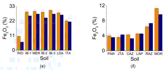 When the oxide percentages in the 2–1 mm and <45 μm aggregate sizes were compared, the Al2O3 concentration increased in the latter in the clayey soils (Table 1 and Table 2 and Figure 1a). Regarding SiO2 (Figure 1c), differences were verified between the aggregate sizes for RIO, IB-2, IB-3, and ITA (Table 2). For Fe2O3 (Figure 1e), the 2–1 mm aggregate size exhibited the highest concentration among the clayey soils (Table 2). However, even with the differences observed in the major soil oxides (Al2O3, SiO2, Fe2O3) among the clayey soils, we verified that most of them presented the same variation trend, regardless of the aggregate size. In the loamy/sandy soils, small aggregates (<45 μm) presented the highest concentration of Al2O3 (Figure 1b), except for PAR (Table 2). For SiO2 (Figure 1d), the 2–1 mm aggregates exhibited, in general, the highest concentrations among the soils, except for PAR and CAZ. MOR was a unique soil with no differences between the aggregate sizes for SiO2 (Table 2). For Fe2O3 (Figure 1f), we did not find a clear trend in its concentration among the aggregate sizes. Soils with differences between the aggregate sizes for Fe2O3 were JTA, CAZ, RAZ, and MOR (Table 2). However, we noticed that for the loamy/sandy soils, only Al2O3 demonstrated a similar trend between the aggregate sizes.