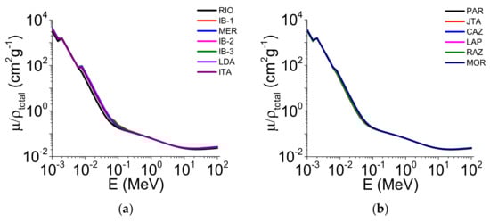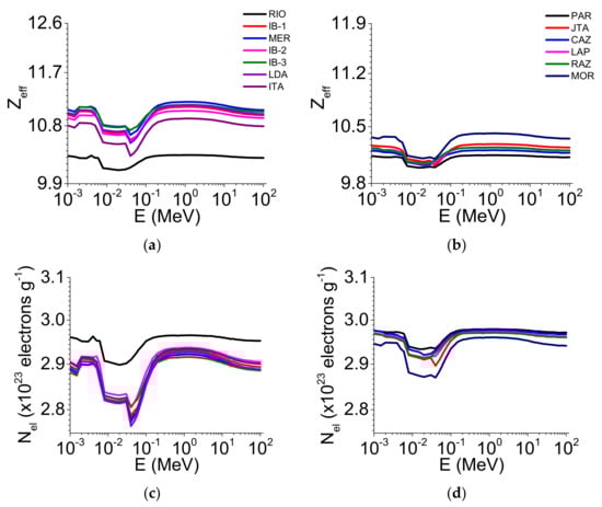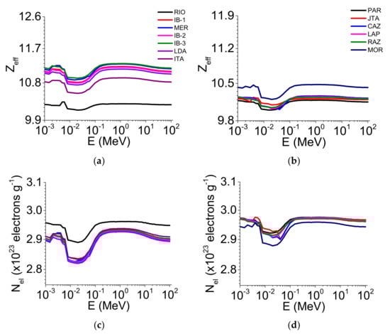 The Zeff (Figure 3a,b) and Nel parameters (Figure 3c,d) were also influenced by the soil chemical composition, as noticed for σM. RIO exhibited the lowest Zeff (Figure 3a) while IB-3 and MER showed the highest values (10−3 to ~102 MeV) in the clayey soils. For the loamy/sandy soils, PAR and CAZ had the lowest Zeff (Figure 3b) and MOR the highest (10−3 to ~102 MeV). Regarding Nel, its lowest and highest values occurred in LDA and RIO, respectively, for the clayey soils (Figure 3c). In contrast, MOR presented the lowest value in the loamy/sandy soils while PAR and JTA showed the highest values in the energy region from 10−3 to ~102 MeV (Figure 3d).