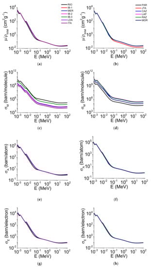 The mass attenuation coefficient (Figure 2a,b) presented a sharp decrease between 10−3 and ~10−1 MeV photon energies in all the soils investigated. In the intermediate to high energy region >10 MeV, a small increase in μ/ρ was noticed. We found that only some clayey soils (RIO, IB-1, LDA, ITA) showed differences in μ/ρ (Figure 2a), which occurred in the energy region from ~10−2 to ~10−1 MeV (Table 3). The molecular cross-section (Figure 2c,d) was more sensitive to the soil chemical composition than μ/ρ. Among the clayey soils, the lowest σM was found in IB-1 (10−3 to ~102 MeV) while RIO (E < 10−2 MeV and E > 10−1 MeV) presented the highest value (Figure 2c). For the energy region 10−2 < E < 10−1 MeV, IB-2 showed the highest σM (Figure 2c). The same behavior was observed in the loamy/sandy soils (Figure 2d), with the lowest value observed in PAR and the highest in CAZ (10−3 to 102 MeV). The parameters σA and σE (Figure 2e–h) showed similar μ/ρ behavior in both soil groups. The highest differences among the soils investigated were slight and found for the clayey soils in the energy region of ~10−2 to ~10−1 MeV (Figure 2e,g).