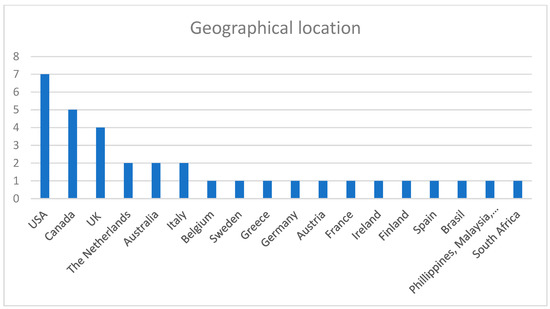 A total of 11 of the 27 studies were from European countries, 3 of which were conducted in the United Kingdom (UK), 1 of them in partnership with the Netherlands, and 1 with Belgium. However, most studies were from the American continent, seven of which were from the United States (one of them in partnership with Brazil), five were from Canada (one of them in partnership with the Netherlands and the UK), two were from Australia, and one study was from the Philippines. There is also one study from South Africa. (Please refer to Scheme 1).