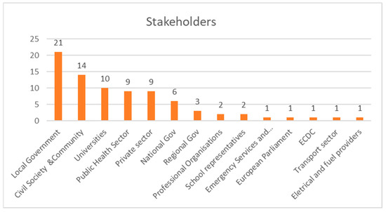 - Actions of political scope [8,13,16,17,19,20,26,27,28,29,31,33,34,37,40,43,44] (local, regional, national, and European) are referred to in 17 of the selected studies; mainly, these actions include top-down interventions such as city management and planning, local/regional/national/European policies and control, recommendations, energy solutions, urban planning (street widths, off-street trails for cyclists and pedestrians, neighbourhood playgrounds and parks, sporting and recreational facilities), implementation of policies that support physical activity and active living, improved laws and traffic safety, adaptative measures to extreme weather and other climate variability, projects to protect residents, integration of nature-based solutions that improve microclimate, limit urban heat and improve air quality, increasing green urban spaces, promote active transport, fiscal and regulatory measures, underground parking, leisure parks, flood defences, review flood maps, review cooling capacity on local facilities and backup generators, review insurance policies, claiming leadership, implementing low carbon society, work in partnership with multistakeholder groups, translate science to lay audience, evaluate local adaptation plans, improve public transport networks, mandatory vehicle inspections, road charges, reduce speed of vehicles, and walking to school policies, among others.