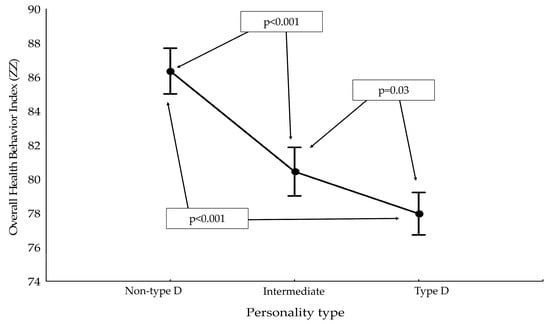 There are a variety of psychological factors, including the patient’s personality, that can have a significant impact on the uptake of health-promoting attitudes [,]. In the present study, type D personality was found to increase the risk of engaging in improper health behaviors by more than five times. In addition, the results indicate that patients with distressed personality represent the least effective mental attitude (3.0 sten) (Positive Mental Attitude subscale) and the least effective preventive behaviors (2.9 sten) (Preventive Behaviors subscale) and are significantly different in this regard from the other personality types (intermediate and non-type D). In contrast, for eating habits and health practices, the results achieved by those with type D personality (3.53 and 3.49 sten, respectively) are at an average level. Comparing the authors’ results with other studies, it can be seen that type D personality is always associated with poorer health care, but there are some differences in the levels of particular types of behavior.