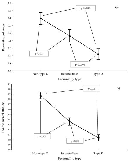 For Preventive Behaviors, the non-type D personality had the highest score of 3.3 ± 0.5, followed by a lower score for those with an intermediate type personality of 3.1 ± 0.5, and the lowest score was obtained by individuals with a type D personality, of 2.9 ± 0.4. The results obtained were significantly different from each other, as shown in Figure 2a.