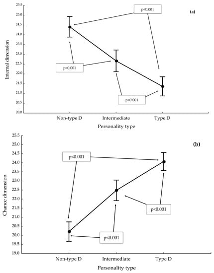 The highest mean score on the Chance Dimension subscale was obtained by those with type D personality (24.0 ± 2.6), followed by those with intermediate personality (22.4 ± 3.6), and finally by respondents with non-type D personality (20.2 ± 3.6). These differences were statistically significant (Figure 3b).