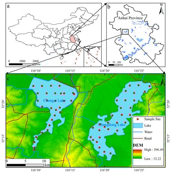 Location and distribution of sampling sites. (a) The geographical location of Anhui Province; (b) geographical location of the study area; (c) digital elevation models (DEM) around Chengdong Lake and Chengxi Lake and their relative positions. Spatial location of sampling points for lake sediment.