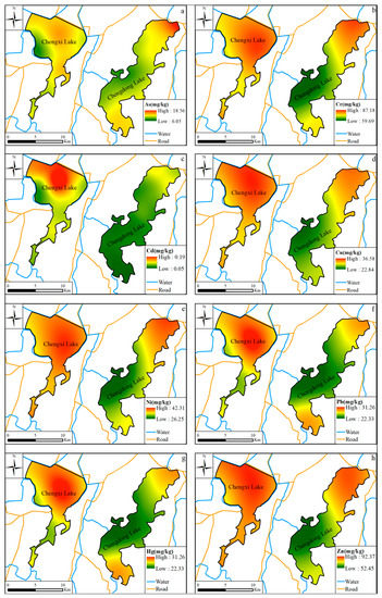 The distribution of heavy metals in the sediment of Chengxi Lake and Chengdong Lake had obvious spatial heterogeneity (Figure 2). The spatial distribution of Cr, Cu, Ni, and Zn elements was consistent, and the high-value areas were located in the center of the Chengxi Lake and the northeast corner of the Chengdong Lake. As and Pb elements were relatively consistent in their spatial distribution, with the high-value area of Chengxi Lake mainly located northeast of the lake center while the high-value areas of Chengdong Lake were mainly located in the northeast and southwest corners. The spatial distribution of Cd and Hg concentrations showed relative uniqueness: The high-value areas of Cd were mainly located north of the lake center of Chengxi Lake and in the northeast corner of Chengdong Lake in a relatively uniform distribution, while the high-value areas of Hg were mainly located southeast of the lake center of Chengxi Lake and in the north of Chengdong Lake, showing a relatively uniform distribution.