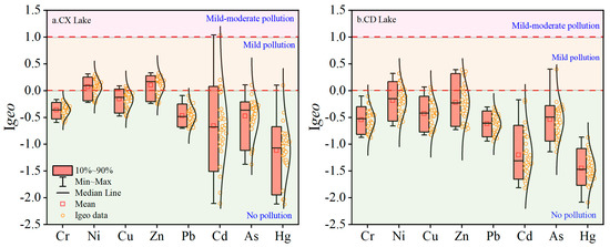Boxplots of Igeo of heavy metals in sediments. (a) Chengxi Lake; (b) Chengdong Lake.