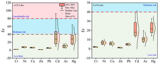 Boxplots of Er of sediment heavy-metal elements. (a) Chengxi Lake; (b) Chengdong Lake.