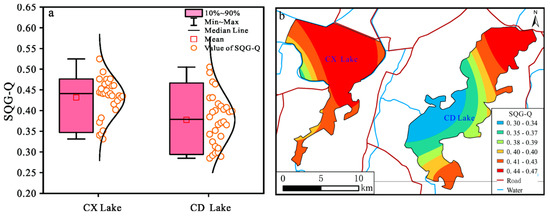 The mean sediment quality guideline quotients (SQG − Qs) of Chengxi Lake and Chengdong Lake were 0.43 and 0.38, respectively (Figure 7a), which showed a moderate degree of potential adverse bio-toxicity. Cr, Ni, and As contributed greatly to the SQG − Q value, which may be influenced by the high background value. The overall SQG − Q value of Chengxi Lake was higher than that of Chengdong Lake, so we should focus on the potential adverse bio-toxicity of Chengxi Lake to prevent aquatic organisms from being affected by it.