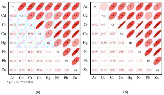 The correlation of heavy metals in sediments is shown in Figure 8. There was a significant correlation (p < 0.01) between any two of the four elements Cr, Zn, Ni, and Cu in the sediments of the study area, and the correlation coefficient was as high as 0.97 (Cr-Ni-Cu), which indicated that the four elements Cr, Zn, Ni, and Cu had the same source. There was a strong correlation between any two of the four elements Pb, Cd, As, and Hg, indicating that Pb, Cd, As, and Hg may have the same sources [36].