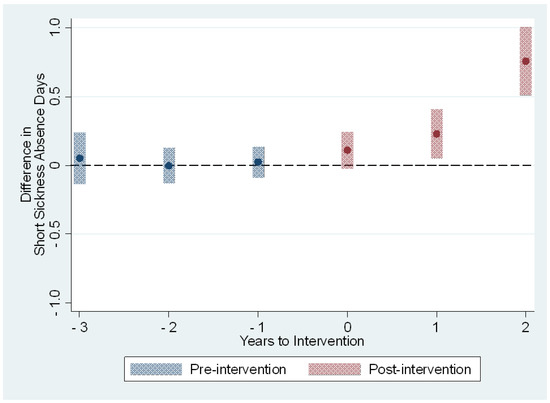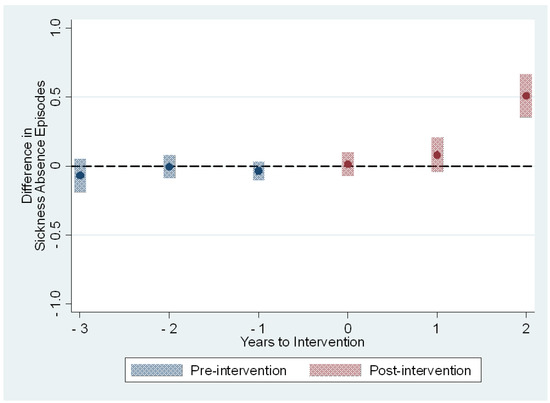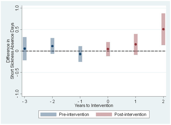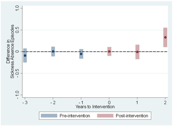We tested the conditional parallel trends assumption by using the event study regression. We aimed to show that there are no pre-intervention difference-in-differences in the sickness absence outcome measures between the intervention and control groups. This was done to find support for our main identification assumption that employees with the same characteristics would follow the same outcome trend in the absence of the intervention.
