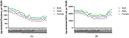 (A) Age-standardized prevalence rate (per 100,000) of both males and females with asthma in China during 1990 to 2019. (B) Age-standardized DALYs rate (per 100,000) of both males and females with asthma in China during 1990 to 2019. (Generated from data available at http://ghdx.healthdata.org/gbd-results-tool, accessed on 26 June 2022).