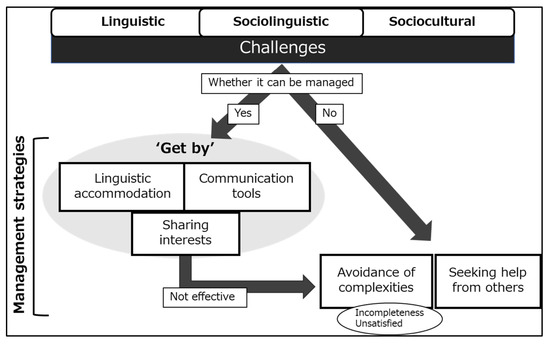Language management theory was employed as the conceptual framework. In this theory, comprehensive competence that integrates linguistic, sociolinguistic, and sociocultural aspects is essential for maintaining cross-cultural interactions in contact situations [31,32]. Specifically, the processes of managing problems consist of five stages [31]: (i) deviations from norms occur in a communicative situation, (ii) such deviations are noted, (iii) noted deviations are evaluated, (iv) adjustment is planned, and (v) the adjustment is implemented. All communication problems and phenomena occurring in cross-cultural settings can be related to the above-mentioned stages of the management process.