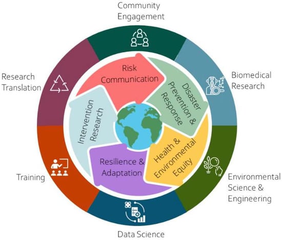 Climate change is affecting the health of populations across the world, intensifying the need for a health-centered response that improves health and well-being. Adapting to climate change requires preventing human exposure to harmful substances, reducing vulnerability to climate hazards, and minimizing health risks related to climate change []. NIEHS and SRP have been leaders in supporting research to understand the connection between climate change and human health [,,,]. These activities are also in line with the NIH Climate Change and Health Initiative and Strategic Framework, a coordinated effort by NIEHS and other NIH Institutes and Centers to support research, training, and capacity building activities that address the climate change and health crisis on a global scale [] and Executive Orders []. SRP’s systems-focused multidisciplinary centers (see Figure 1) can serve as a model for how best to integrate diverse research surrounding a common, complex problem such as climate change to better understand the larger picture and identify solutions [,,]. Much of the existing research, tools, and infrastructure developed by SRP grantees, such as new sampling and analytical techniques and advanced methods, can be adapted and scaled up to address climate change issues in different contexts to protect public health. Similarly, grantees’ insights into sustainable and climate-resistant strategies to address and clean up pollutants can inform better approaches to reduce the amount and toxicity of hazardous substances in a dynamically changing environment.
