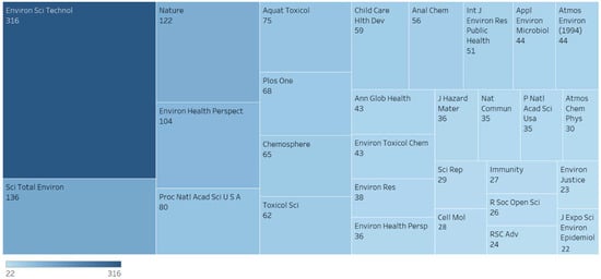 Top journals where SRP grantees have published climate change-related work and number of articles. This image illustrates the breadth and diversity of SRP grantee research within this area, including toxicology, epidemiology, environmental justice, environmental chemistry, and more.