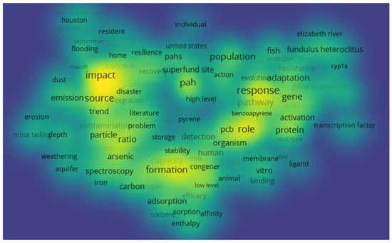 Density map of title and abstract keywords for all SRP grantee publications related to climate change (all time) generated in VOSviewer. A larger font size and yellow color indicate a higher frequency of keyword occurrence. The distances between each of the keywords indicate the relatedness of the research topics.
