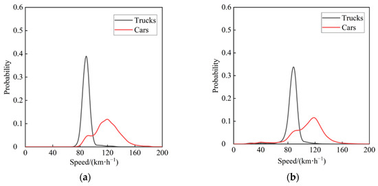 (a) Speed distribution on four-lane divided freeways; (b) speed distribution on six-lane divided freeways.