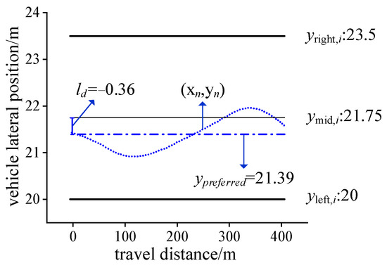 where n is the number of trajectory points; yn is the longitudinal coordinate of the vehicle’s the nth trajectory point; ypreferred is the preferred trajectory, representing the driver’s lateral preference position in the lane; ld is the preferred trajectory deviation. When the preferred trajectory falls on the left of the centerline of the lane, the preferred trajectory deviation is negative. Otherwise it is positive. In this study, the 15th and 85th percentile of the preferred trajectory are used as the feature numbers to show the drivers’ lane utilization.