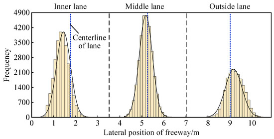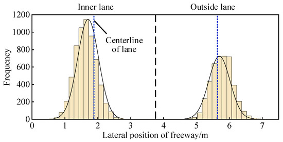 The HighD Dataset, a drone dataset of naturalistic vehicle trajectories on German freeways, is used as the data source for freeway vehicle lateral position analysis in this paper [24]. The recordings took place during sunny and windless weather from 8:00 a.m. to 5:00 p.m. A total of 11.5 h of aerial video with a frame rate of 25 Hz was recorded, 110,000 single continuous vehicle trajectory is extracted (including approximately 20,000 trucks). The total mileage of vehicles recorded was 45,000 km, including 5600 complete lane change records. The position error is typically less than 10 cm when using state-of-the-art machine learning algorithms. Center of mass position (trajectory point) and movement of the vehicles appearing in each frame are recorded from a bird’s eye view, including detailed information such as vehicle size, vehicle type, driving direction, speed, and description of surrounding vehicles.