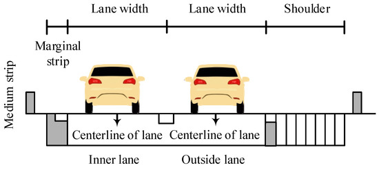 Table 1 shows the lane width specifications provided by several industrialized countries’ freeway construction standards and regulations [1,2,3,4,5,6]. The distribution range of the lane width is 3.5~3.9 m. For example, China’s Freeway Route Design Specification (JTG D20—2017) [1] stipulates that the lane width is 3.75 m when the design speed of the freeway and Class-A road (arterial road that access can be controlled as needed) is 80 km/h or above. It can be found that the specified lane width in most countries is based on the cross-sectional layout of mixed traffic mode [2,3,4,5,6], where the key technical indicators are controlled by large vehicles (2.55 m in body width of representative model), taking into account the swing offset and lateral margin of vehicles in the lane, so the lane width has a large surplus relative to the body width, especially for cars (1.8 m in body width of representative model). In a lane keeping scenario, drivers have more freedom in trajectory selection, and the vehicles deviate laterally from the lane’ s centerline, resulting in trajectory selection preferences. In addition to design redundancy, it will also lead to accidents related to lane deviation, such as side impact, rear-end collisions, and run-off-road crashes. Therefore, a thorough understanding of drivers’ trajectory selection behavior is the basis of lane width design and also helps to improve road safety conditions.