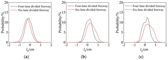 As shown in Figure 10a, the mean and peak of the preferred trajectory deviation of cars in the six-lane divided freeway lane are greater than those in the four-lane divided freeway lane, and drivers are more inclined to drive close to the roadway edge line. Still, the distribution pattern is not significantly different. Figure 10b depicts the preferred trajectory distribution of the outside lane in two scenarios: a six-lane divided freeway versus a four-lane divided freeway, with the six-lane divided freeway having more significant right deviation distance from the centerline. The probability distribution curves of trucks in the outside lanes of two scenes are superimposed in Figure 10c. The probability distribution curve of four-lane divided freeway trucks has two peaks, and the probability distribution curve of six-lane divided freeway trucks has a right side deviation, indicating that, when compared to four-lane divided freeway vehicles, the center of mass of six-lane divided freeway vehicles prefers to be located on the right while driving in the outside lane. This could be due to the fact that the width of the adjacent lanes in the six-lane divided freeway scene is narrower than in the four-lane divided freeway scene, which interferes with truck lateral driving behavior to some extent, and truck drivers tend to keep a larger distance.