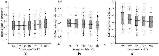 Figure 11 and Figure 12 show the relationship between speed and the preferred trajectory deviation of a four-lane divided freeway and a six-lane divided freeway, respectively. Figure 11a and Figure 12a show that as driving speed increases, the lateral distance between the vehicle in the inner lane and the left guardrail tends to increase, indicating that the demand for the vehicle’s lateral safety margin increases as well. Furthermore, the preferred trajectory of the middle lane continues to move to the left (Figure 12b). Figure 12b,c show that the outside lane tends to drive towards the centerline of the lane, and the preferred trajectory distribution range in the inner and middle lanes also tends to shrink.